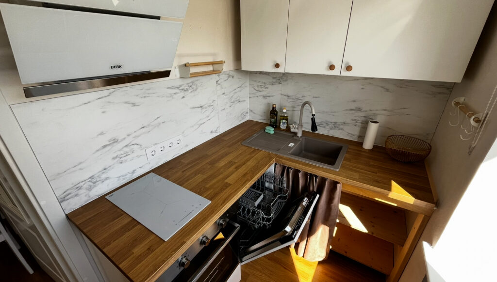 8m2 väiksesse ruumi mahtus imekombel Ikea köögimööbel, segisti, nõudepesumasin, pliit, ahi, ventilatsioon, külmkapp. Töö oli tehtud kiirelt ja puhtalt.